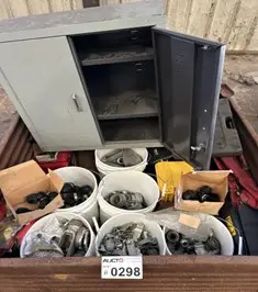 MISCELLANEOUS CONDUIT FITTINGS, METAL CABINET, & MISC HAND TOOLS WITH METAL BIN