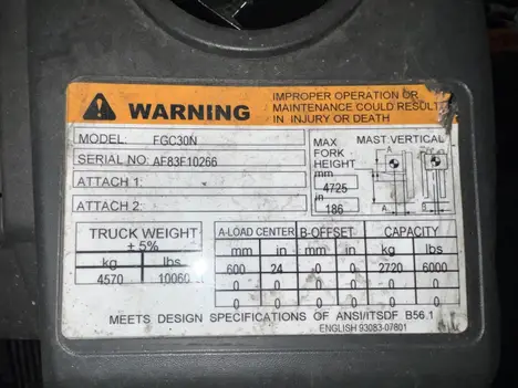 • FUEL TYPE: LPG • LIFTING CAPACITY: 6000 LBS • LIFTING HEIGHT: 186 IN • LOAD CENTER: 24 IN • TIRE TYPE: CUSHION