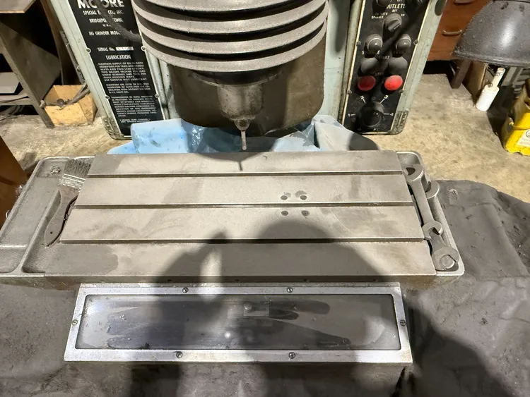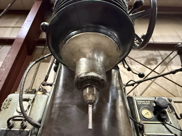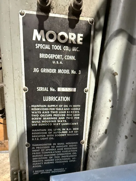 THE MOORE TOOLS JIG GRINDER MODEL NO. 3 OPERATES ON 440V 3PH POWER AND FEATURES AN 11'' × 24'' TABLE WITH 18'' LONGITUDINAL AND 11'' CROSS TRAVEL. THE SPINDLE-TO-COLLECT RANGE IS 2'' – 18'', WITH 10'' SPINDLE-TO-WAYS CLEARANCE AND 13½'' SPINDLE-TO-COLUMN BELOW WAYS. HEAD VERTICAL TRAVEL IS APPROXIMATELY 3⅝''. SPINDLE SPEEDS ARE INFINITELY VARIABLE FROM 40–250 RPM, AND WHEEL SPEED REACHES UP TO APPROXIMATELY 10,000 RPM. SPINDLE FEED RANGES FROM 4–240 SPM, AND THE MACHINE OFFERS AN ANGULAR TILT OF ±1½°. GRINDING CAPACITY IS 0.187'' – 5''. CONTROLS UTILIZE HYDRAULIC/AIR VARIABLE FEEDS AND SPEEDS. THE MACHINE HAS DIMENSIONS OF 80'' × 65'' × 102'' (F×R×H) AND WEIGHS 3,800 LB.