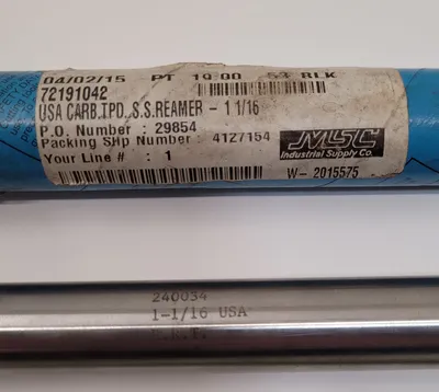 THIS IS AN MSC INDUSTRIAL SUPPLY REAMER, MODEL 240034. IT IS A 1-1/16” SS REAMER FEATURING A CARBIDE-TIPPED REAMER MATERIAL. THE TOOL UTILIZES A STRAIGHT SHANK AND A STRAIGHT FLUTE TYPE. KEY DIMENSIONS INCLUDE A MAXIMUM SHANK DIAMETER OF 7/8 INCH, A FLUTE LENGTH OF 2-3/4 INCHES, AND AN OVERALL LENGTH OF 10-1/2 INCHES. THE SIZE RANGE FOR THIS TOOL IS 1.0031 INCHES TO 1.0660 INCHES.