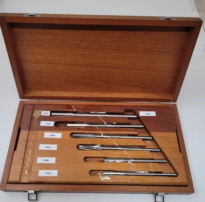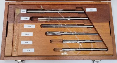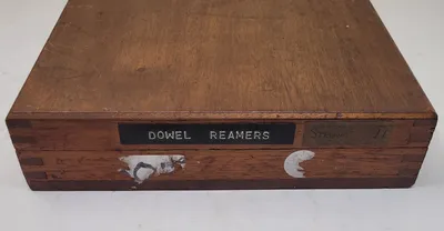 THESE NIELSEN DOWELL REAMERS ARE PROVIDED WITH A COMPLETE SET OF TOOLING AND ACCESSORIES. THE SET INCLUDES REAMER SIZES OF .3115, .3580, .3910, .4355, .4385, AND .4980. THE REAMERS ARE ORGANIZED WITHIN AN INTACT WOOD STORAGE BOX, OFFERING AN IDEAL SOLUTION FOR PRECISE PROJECTS ACROSS VARIOUS APPLICATIONS.