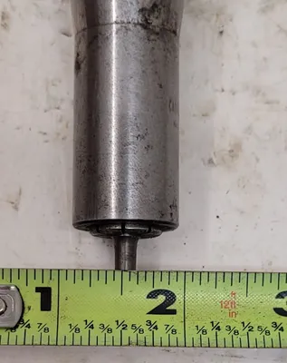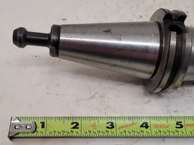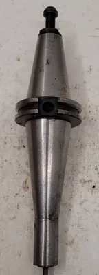 THIS IS A NIKKEN COLLET CHUCK TOOL HOLDER WITH A CAT 40 HOLDER TYPE. THE TOOL HOLDER'S DIMENSIONS INCLUDE A BORE HOLE DIAMETER OF 15MM, A MAXIMUM BODY DIAMETER OF 43.8MM, AND A MINIMUM BODY DIAMETER OF 22MM. THE PROJECTION MEASURES 5-5/8 INCHES, AND THE OVERALL LENGTH WITHOUT THE BUTTON IS 8-1/4 INCHES.