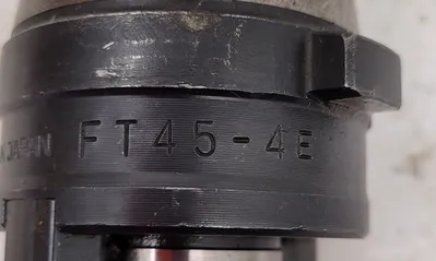 THIS IS A NIKKEN FT45-4E SHELL MILL HOLDER, IDENTIFIED AS PART NUMBER FT45-4E. IT FEATURES A CAT 45 HOLDER TYPE. THE ACCESSORY HAS A 2.30” BODY DIAMETER, A .6” BORE DIAMETER, AND AN OVERALL LENGTH (OAL) OF 5.60”. THE PROJECTION MEASURES 2.125”.