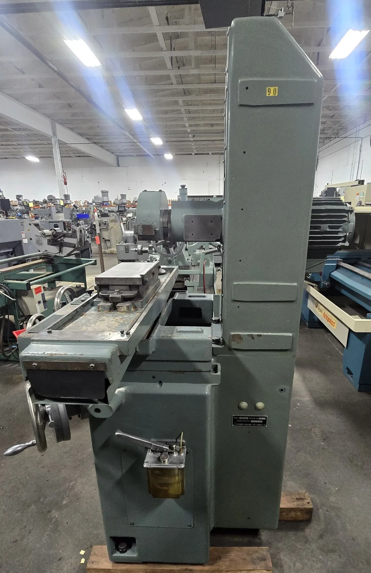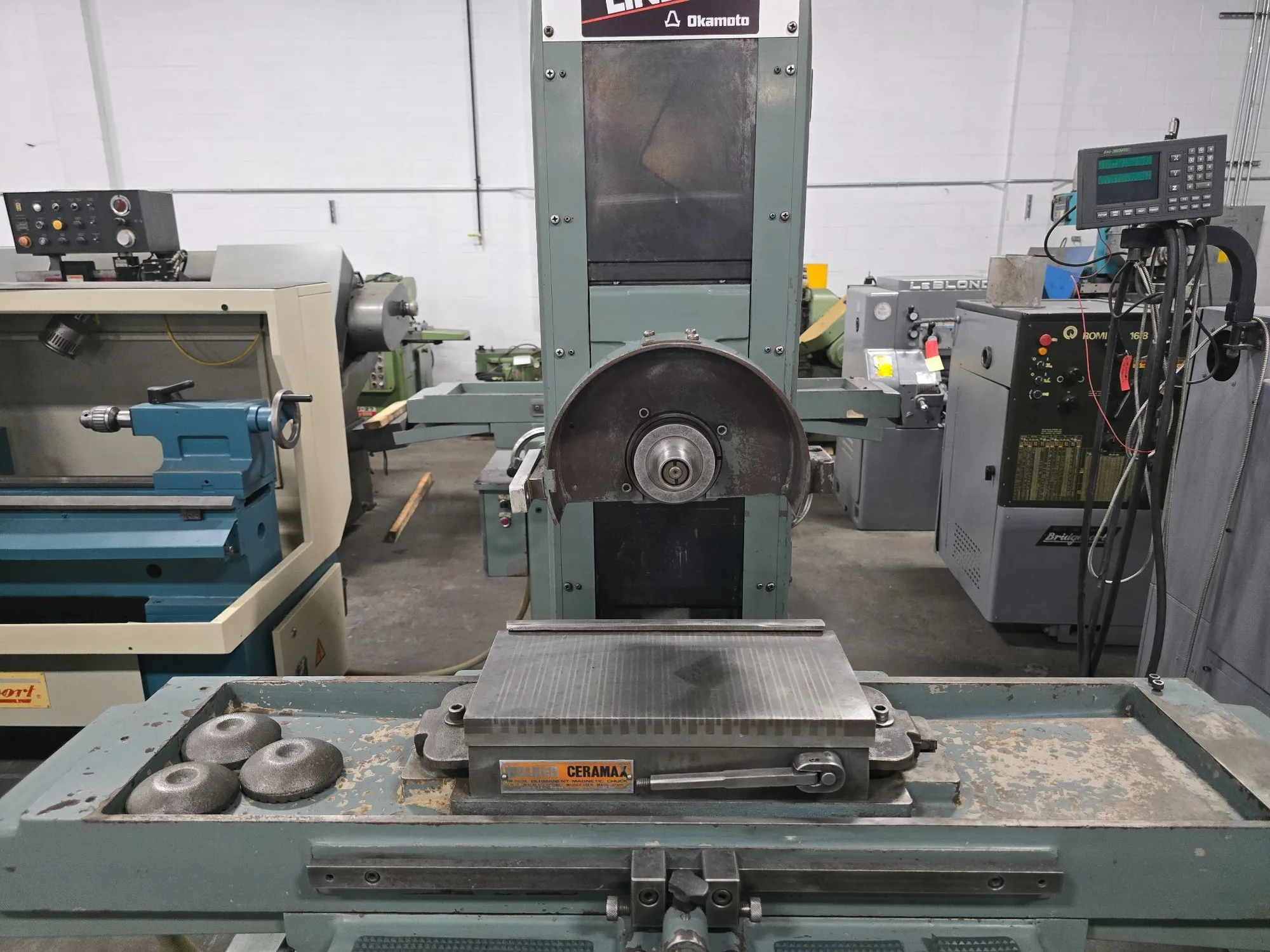 THE OKAMOTO MODEL LINEAR 612/14 IS A MANUAL HIGH-PRECISION SURFACE GRINDER FEATURING A 6" X 12" WORKING TABLE CAPACITY WITH A 14" LONGITUDINAL AND 8" CROSS-TRAVEL CAPACITY. THE MACHINE UTILIZES LINEAR BALL BEARING WAYS FOR SMOOTH LONGITUDINAL MOVEMENT AND MANUAL HAND-FEED CONTROL FOR TABLE AND SADDLE POSITIONING. IT IS POWERED BY A 2 HP SPINDLE MOTOR WITH A SPEED OF 3450 RPM, ACCOMMODATING AN 8" DIAMETER X 1" WIDE GRINDING WHEEL WITH A 1-1/4" BORE. TECHNICAL SPECIFICATIONS INCLUDE A MAXIMUM DISTANCE OF 18" FROM THE TABLE TO THE SPINDLE CENTER AND A MAXIMUM WORK HEIGHT OF 11" UNDER AN 8" WHEEL. VERTICAL FEED RATES ARE 0.050" PER REVOLUTION AND 0.0002" PER GRADUATION, WHILE CROSS FEED RATES ARE 0.100" PER REVOLUTION AND 0.001" PER GRADUATION. THE UNIT TYPICALLY INCLUDES A 6" X 12" PERMANENT MAGNETIC CHUCK. OVERALL DIMENSIONS ARE APPROXIMATELY 58" X 46" X 71" H, AND THE WEIGHT RANGES FROM 1,650 TO 1,850 LBS.