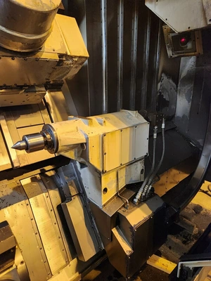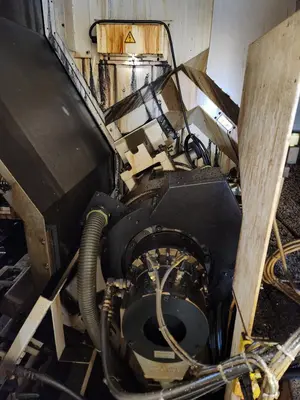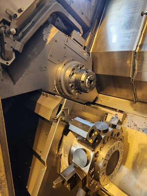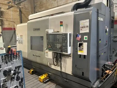 THE OKUMA MACTURN 250-2S/1000 IS A BIG-BORE 5-AXIS CNC TURNING CENTER EQUIPPED WITH LIVE MILLING CAPABILITIES AND AN OSP-P100L CNC CONTROL. IT FEATURES A 30-POSITION AUTOMATIC TOOL CHANGER AND A 5-AXIS MACHINE DESIGN, INCLUDING 360-DEGREE C-AXIS ROTATION (0.001-DEGREE CONTROL ANGLE) AND A 210-DEGREE B-AXIS ANGLE (1-DEGREE INDEXING).
