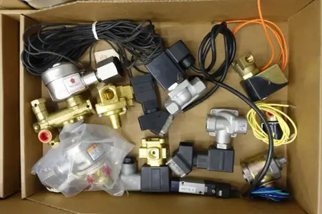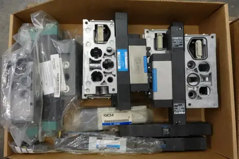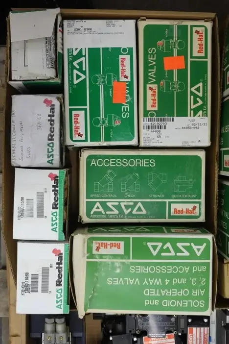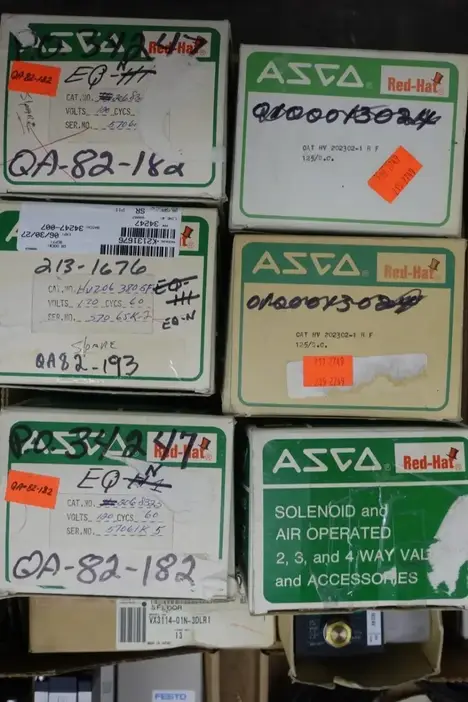 PALLET OF ASSORTED SOLENOID VALVES. ASCO, VERSA,NEW NUMATICS, KOGANEI,FESTO,NEW SMC,NEW PARKER,CIRCLE SEAL,CONVUM,KURODA, HONEYWELL,CKD,BURKERT,NEW MOSIER, REXROTH
