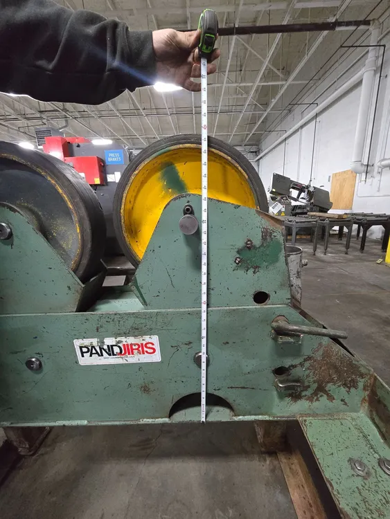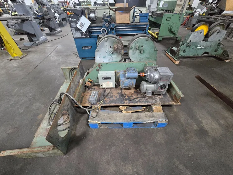 THE PANDJIRIS MM-15/5-T TURNING ROLLS ARE PROVIDED AS A SET OF THREE POWER ROLLS FOR FABRICATING AND WELDING APPLICATIONS. THE POWER ROLL UNIT HAS A CAPACITY OF 15 TONS FOR TURNING AND 5 TONS FOR SUPPORT, OPERATING ACROSS A SPEED RANGE OF 2.1 TO 63.5 IPM. TECHNICAL SPECIFICATIONS INCLUDE A TURNING CAPACITY OF 30,000 LBS, A LOAD CAPACITY OF 10,000 LBS, AND A TRACTIVE EFFORT OF 1,385 LBS. THIS EQUIPMENT IS ENGINEERED TO HANDLE A PIPE DIAMETER RANGE OF 4 INCHES THROUGH 144 INCHES. THE DESIGN INCORPORATES A UNIQUE DRIVE ROLL CONNECTION THAT IS POSITIVELY DRIVEN BY SPUR GEARS, ENSURING A CONSTANT CENTERLINE OF OPERATION WHILE REQUIRING LESS FLOOR SPACE AND ACCOMMODATING VARYING TANK DIAMETERS. THE ROLL SYSTEM FEATURES A 1 HP MOTOR HORSE POWER RATING, A 16-INCH WHEEL DIAMETER, AND A 4-INCH COMBINED WHEEL FACE. CONTROL IS MANAGED BY ELECTRONIC VARIABLE SPEED CONTROLS THAT ARE INFINITELY VARIABLE, ACCESSIBLE VIA A FIELD CHANGEABLE PLUG-IN HAND PENDANT WITH FORWARD-STOP-REVERSE-WELD/RAPID BUTTONS AND A SPEED POTENTIOMETER ON 25 FEET OF CABLE.