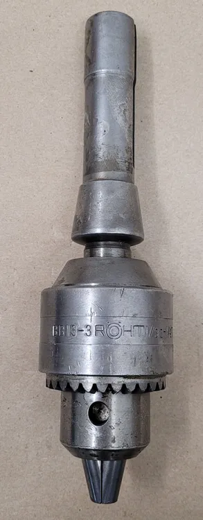 THE ROHM MODEL BB13-3 IS A PRECISION DRILL CHUCK DESIGNED FOR TOOLING AND ACCESSORIES APPLICATIONS. THIS UNIT FEATURES AN R8 HOLDER ARBOR FOR SECURE MOUNTING AND OFFERS A DRILLING CAPACITY RANGE FROM 1/32 INCH UP TO 1/2 INCH. THE CHUCK IS IDENTIFIED BY THE PART NUMBER BB13-3 AND REQUIRES A K3 KEY FOR ADJUSTMENT AND OPERATION.