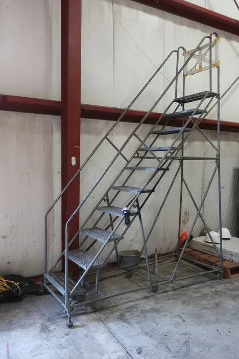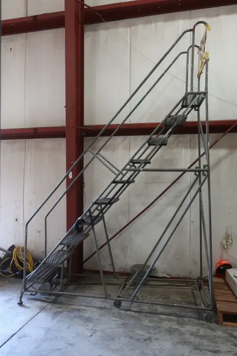 ROLLING WAREHOUSE LADDER, BROKEN BACK REST