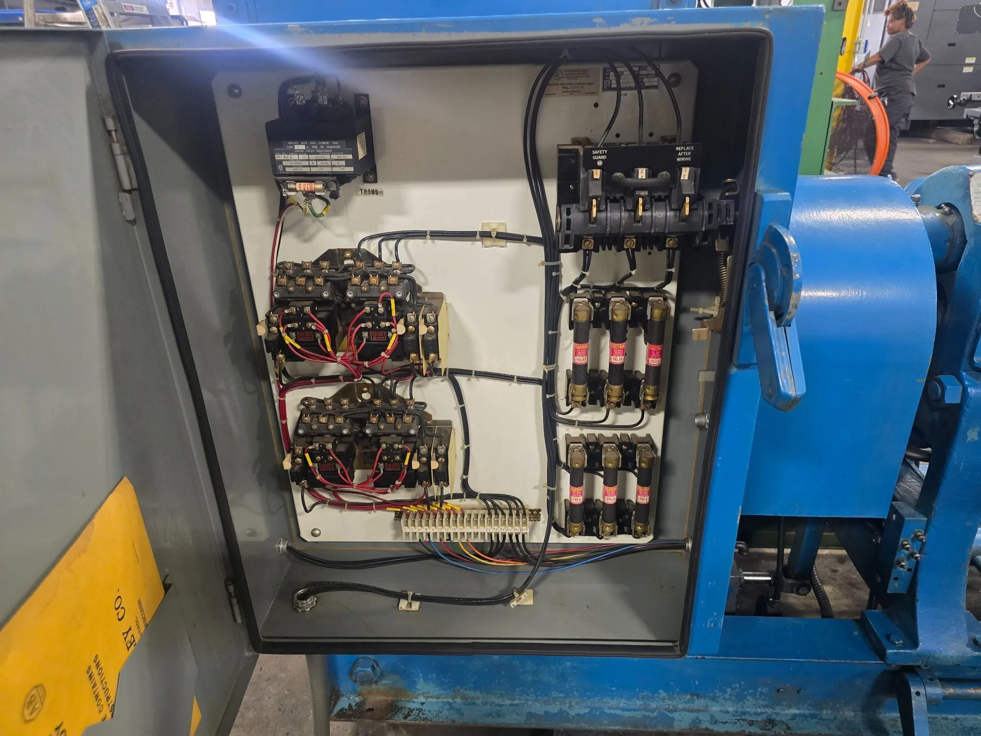 THE ROLSHEAR 3D5 PLATE BENDER/ROLL IS A MECHANICAL FABRICATION MACHINE EQUIPPED WITH THREE ROLLS AND CONFIGURED WITH AN INIT PINCH SYSTEM. THIS PLATE ROLL IS RATED FOR A MAXIMUM CAPACITY OF 10 GAUGE MILD STEEL OVER A 60-INCH LENGTH. THE MACHINE FEATURES 5-FOOT LONG ROLLS, EACH WITH A 6-INCH DIAMETER. ROLL ADJUSTMENT FUNCTIONALITY IS SPLIT BETWEEN MANUAL CONTROL FOR THE FRONT ROLL AND ELECTRIC CONTROL FOR THE BACK ROLL. OPERATIONAL FEATURES INCLUDE A DUEL FOOT BRAKE AND AN AIR-OPERATED PART RELEASE MECHANISM. THE UNIT HAS PHYSICAL DIMENSIONS OF 10 FEET LONG, 4 FEET WIDE, AND 5 FEET HIGH, WITH AN APPROXIMATE OPERATING WEIGHT OF 4500 POUNDS.