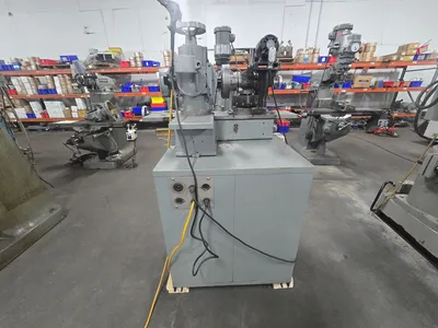 THE ROYAL OAK MODEL RO UNIVERSAL GRINDER IS A CYLINDRICAL GRINDER FEATURING A LONGITUDINAL SLIDE AND A RIGID LEADSCREW DRIVEN CROSS SLIDE TO SUPPORT THE FIXTURE. IT INCLUDES A STURDY MOTOR COLUMN MOUNTED ON THE CROSS SLIDE, CARRYING A DOUBLE-END GRINDER MOTOR ARRANGED FOR RAISING, LOWERING, TILTING, OR 360-DEGREE INDEXING OF THE GRINDING WHEEL. KEY SPECIFICATIONS INCLUDE A MAXIMUM DIAMETER BETWEEN CENTERS OF 5-1/2″ (140MM) AND A MAXIMUM LENGTH BETWEEN CENTERS OF 8″ (203MM). THE SYSTEM OPERATES ON 240V 3 PHASE POWER AND INCLUDES A HEAVY DUTY WELDED STEEL CABINET, 6 JAW CHUCK, AND VARIOUS TOOLING. ELECTRICAL CONTROLS ARE HOUSED IN A DRAWER-TYPE COMPARTMENT ANGLED FOR OPERATOR VIEWING.