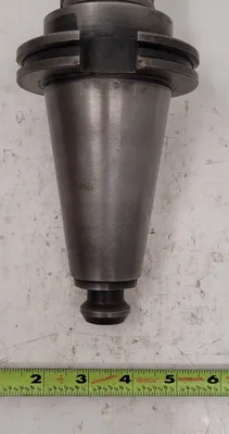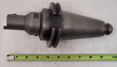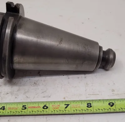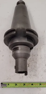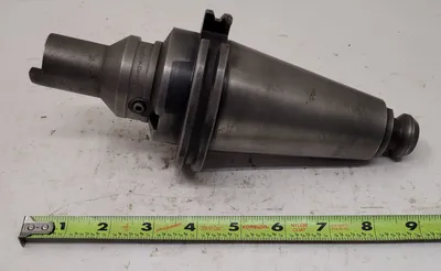 THIS TOOLING SET IS A SANDVIK COROMANT CAT50 TAPER TYPE ASSEMBLY, INCLUDING TWO TOTAL PIECES: A HOLDER (PART NUMBER: A390.45-50 50 040M) AND A VARILOCK (PART NUMBER: A391.25-16 05 065M). TECHNICAL SPECIFICATIONS INCLUDE AN INNER BORE DIAMETER OF 0.625 INCHES, AN OUTER BORE DIAMETER OF 1.25 INCHES, A BODY DIAMETER OF 1.95 INCHES, AND A PROJECTION OF 4.5 INCHES. THE OVERALL ASSEMBLED LENGTH WITHOUT THE BUTTON IS 8.75 INCHES.