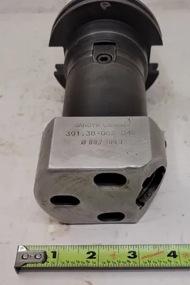 THE SANDVIK COROMANT BORING HEAD, MODEL 391.38-085 042, IS DESIGNED FOR PRECISE BORING TASKS. IT COMES WITH A CAT 50 SPINDLE TYPE TOOL HOLDER AND INCLUDES VARILOCK NUMBERS A390.4550 63 050M AND 391.38-063 63 070. THE OVERALL LENGTH WITH ALL ATTACHMENTS IS 13 INCHES, WITH A PROJECTION OF 6.25 INCHES FROM THE HOLDER.