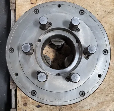 THIS IS AN SCA 12" 3 JAW CHUCK, MODEL 413185, FEATURING A 12-INCH DIAMETER AND A D1-8 MOUNT WITH 6 PINS FOR SECURE ATTACHMENT. IT HAS A 4-INCH CENTER HOLE, 3 JAWS, AND 3 T-SLOTS. THE HUB ID MEASURES 5-3/8 INCHES.