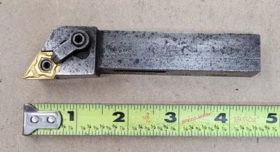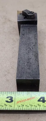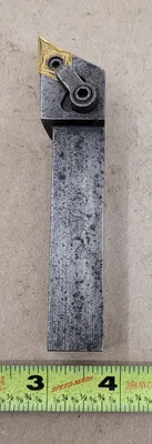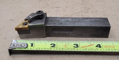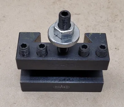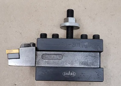THE SHARS 250-301 IS A CXA 1 QUICK CHANGE TOOL POST HOLDER DESIGNED FOR LATHES WITH A SWING RANGE OF 13 TO 18 INCHES. IT ACCOMMODATES TOOL CAPACITIES RANGING FROM 1/2 INCH TO 3/4 INCH. THE HOLDER FEATURES A WEDGE MEASURING 2-1/8 INCHES, WITH OVERALL DIMENSIONS OF 3-1/4 INCHES IN LENGTH, 1-3/8 INCHES IN WIDTH, AND 2-1/8 INCHES IN HEIGHT, EXCLUDING THE MIDDLE SCREW. INCLUDED WITH THE TOOL POST HOLDER IS A KENNAMETAL MDJNR-124B TOOL HOLDER, WHICH HAS A SHANK HEIGHT AND WIDTH OF 19.05 MM, AN F DIMENSION OF 25.4 MM, AND A TOOL LENGTH OF 114.3 MM. THE HEAD LENGTH OF THE TOOL HOLDER IS 35.052 MM, AND IT IS COMPATIBLE WITH DN..432 GAGE INSERTS. THE LOCK PIN ID DRIVE SIZE IS 3/32, AND THE CLAMP SCREW ID DRIVE SIZE IS 1/8.