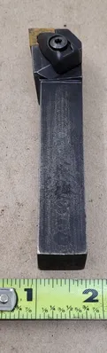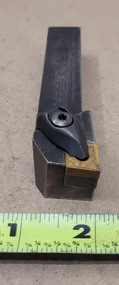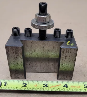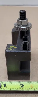 THE SHARS 250-301 TOOL POST HOLDER IS A CXA 1 QUICK CHANGE TOOL POST HOLDER DESIGNED FOR LATHES WITH A SWING RANGE OF 13 TO 18 INCHES. IT ACCOMMODATES TOOL CAPACITIES RANGING FROM 1/2 INCH TO 3/4 INCH. THE HOLDER FEATURES A WEDGE WITH DIMENSIONS OF 2-1/8 INCHES, A LENGTH OF 3-1/4 INCHES, A WIDTH OF 1-3/8 INCHES, AND A HEIGHT OF 2-1/8 INCHES, EXCLUDING THE MIDDLE SCREW. INCLUDED WITH THIS TOOL POST HOLDER IS THE SECO DCLNR-12-4B TOOL HOLDER, WHICH HAS A SHANK HEIGHT AND WIDTH OF 3/4 INCH EACH. THE TOOL HOLDER HAS A LEAD ANGLE OF 95 DEGREES AND AN OVERALL LENGTH OF 4-1/2 INCHES. IT IS DESIGNED WITH A NEGATIVE RAKE AND IS CONFIGURED FOR RIGHT-HAND USE. THE INSERT SIZE CODE FOR THIS TOOL HOLDER IS CN43, AND IT FEATURES A RAKE ANGLE OF -6 DEGREES.