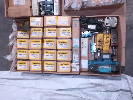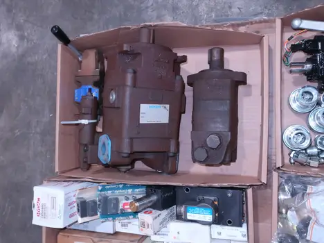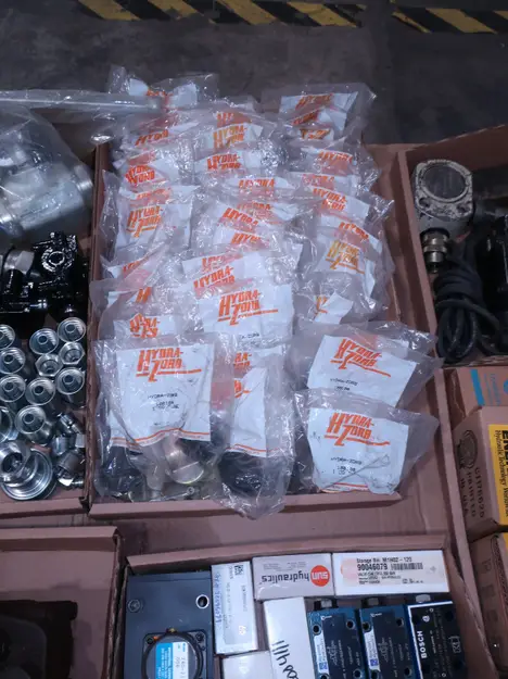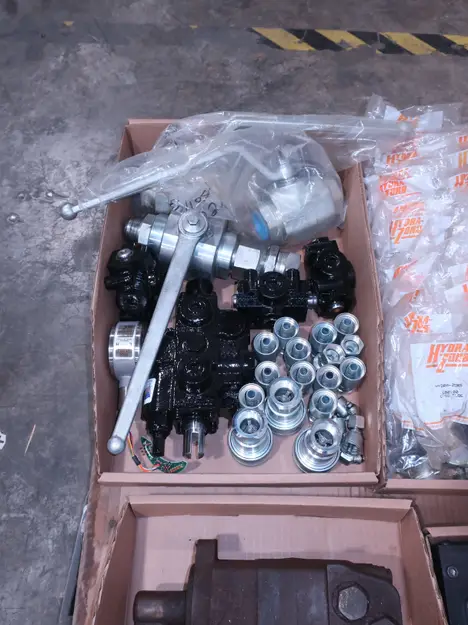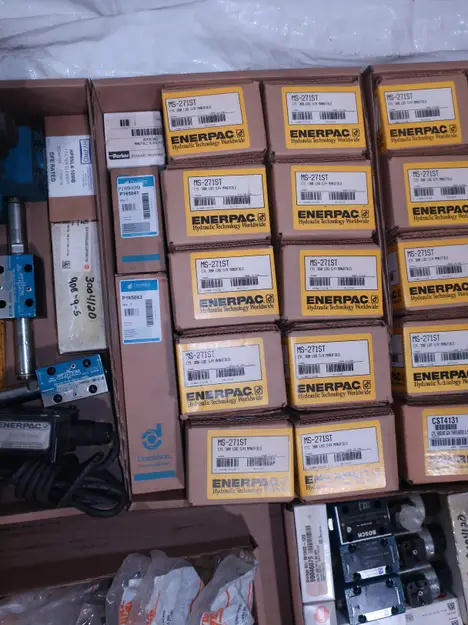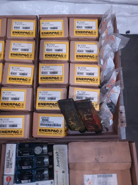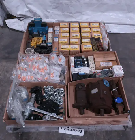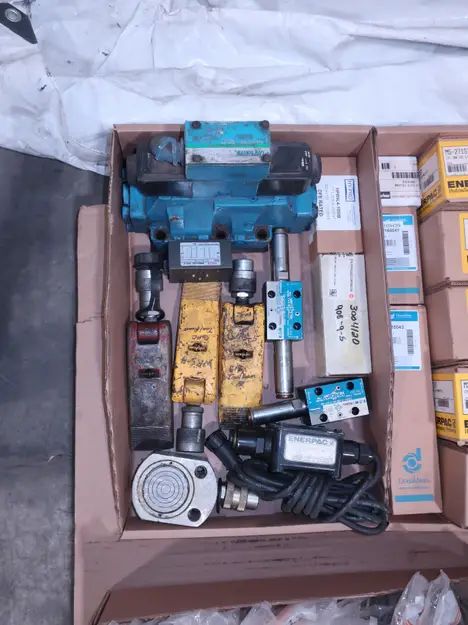PALLET OF ASSORTED HYDRAULICS AND PARTS, VALVES, FILTERS, FITTINGS, VICKERS, ENERPAC, SUN HYDRAULICS, HYDRA ZORB, HYDAC, BOSCH, REXROTH, PARKER