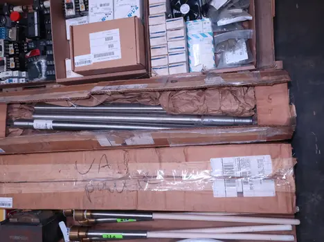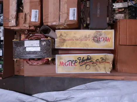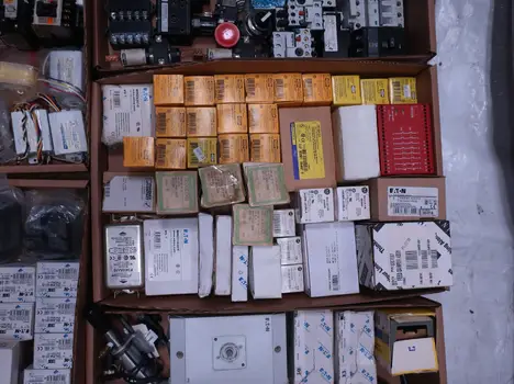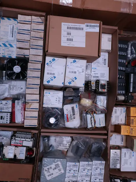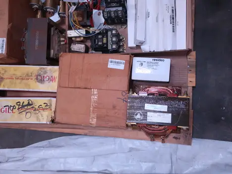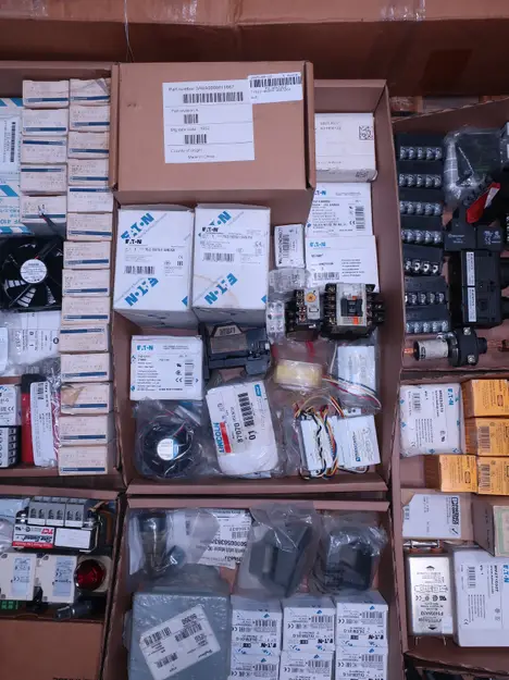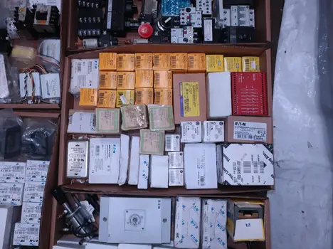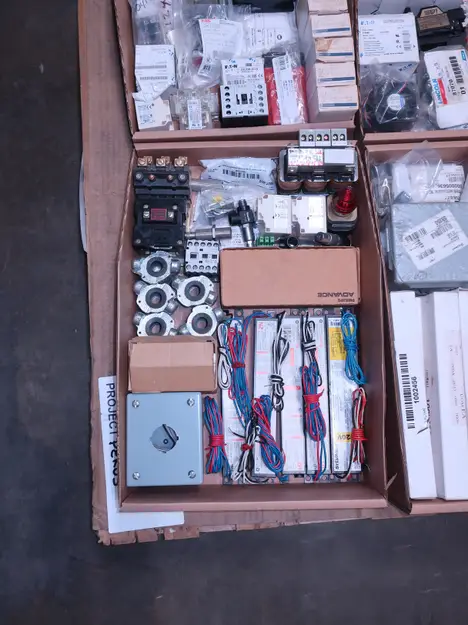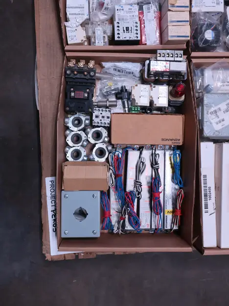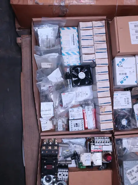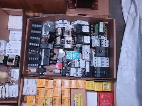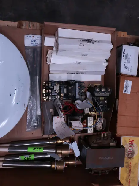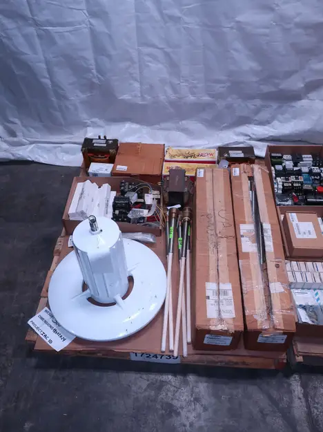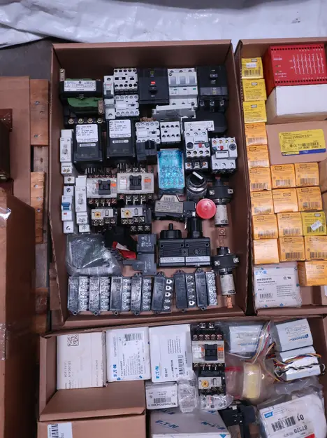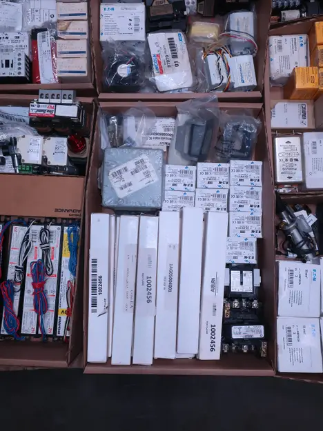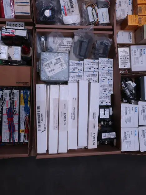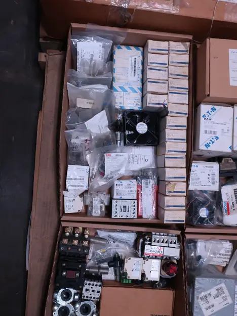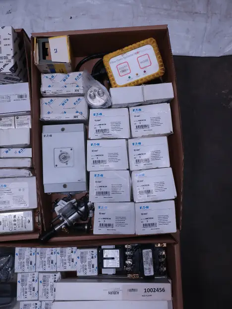 2 PALLETS OF ASSORTED ELECTRICAL COMPONENTS, CIRCUIT BREAKERS, RELAYS, COILS, TRANSFORMERS, LIGHT, HEATING ELEMENTS, PLUGS, PUSH BUTTONS, MODULES, FLAME RODS, BALLASTS, ENCLOSURES, SWITCHES, GERENAL ELECTRIC, EATON, SQUARE D, HUBBELL, AB, LINCOLN, PHOENIX CONTACTS, OMRON, FUJI, DAYTON, ROBERTSON, SYLVANIA, ADVANCED, SCHNEIDER ELECTRIC, AUBURN, HOFFMAN, TELMECANIQUE, ASCO, CUTLER HAMMER, MCGILL