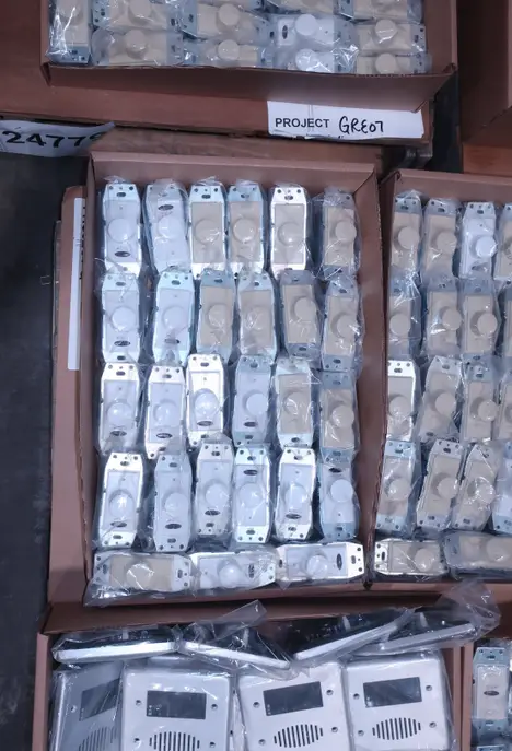 3 PALLETS OF ASSORTED AUTOMATION AND CONTROLS, WALL VOLUME CONTROLS, AUDIO INTERCOM SPEAKER UNITS, ABUS WALL MOUNT KEYPAD