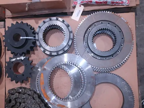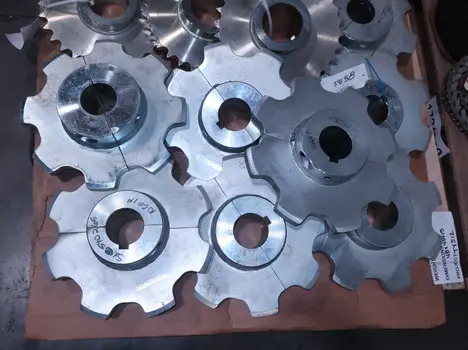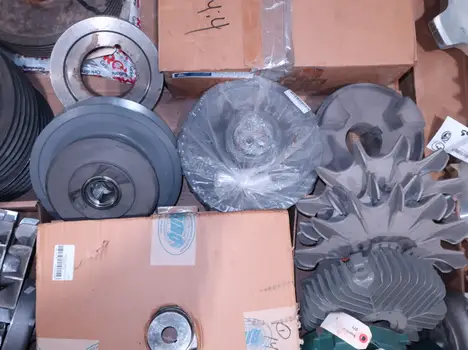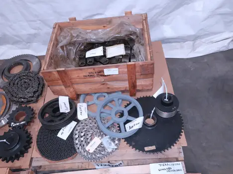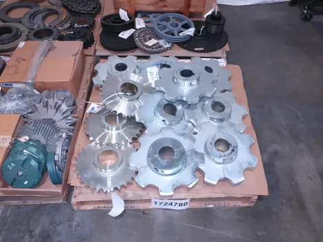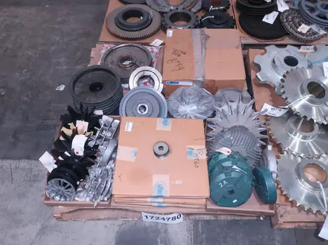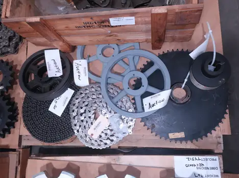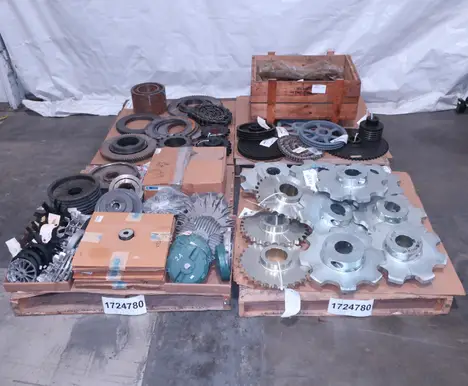 4 PALLETS OF ASSORTED POWER TRANS, ROLLER CHAIN, PULLIES, COUPLINGS, MOTOR FANS, MOTOR COVERS, SPROCKETS, GEARS, MARTIN, BROWNING, DODGE
