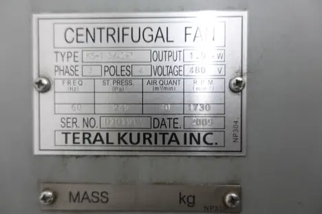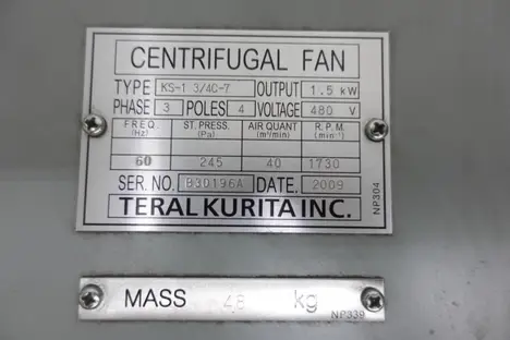 LOT OF 2 TERAL KURITA KS-1 3/4C-7 CENTRIFUGAL BLOWERS, 1730 RPM, 40M3/MIN, 3 PH, 1.5 KW, 480V-AC