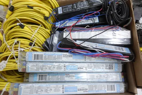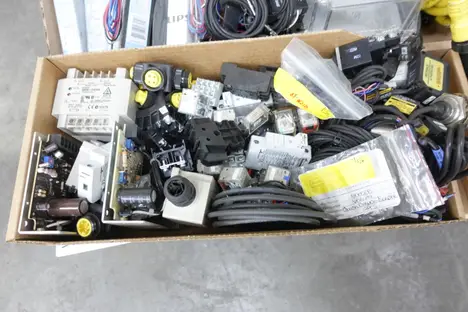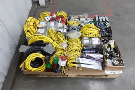 PALLET OF ASSORTED AUTOMATION, CORDSET CABLES, RELAYS, MODULES, SIGNAL LIGHTS, ENCLOSURES, BALLASTS, SWITCHES, SENSORS; OMRON, ALLEN BRADLEY, BUSSMAN, MITSUBISHI, PHILIPS, FEDERAL SIGNAL, TAKACHI, SYLVANIA, KEYENCE, DAYTON, SYMBOL