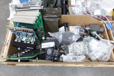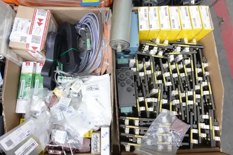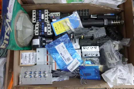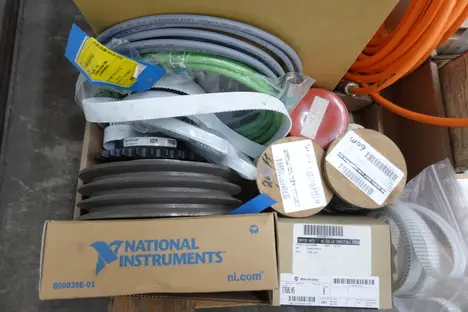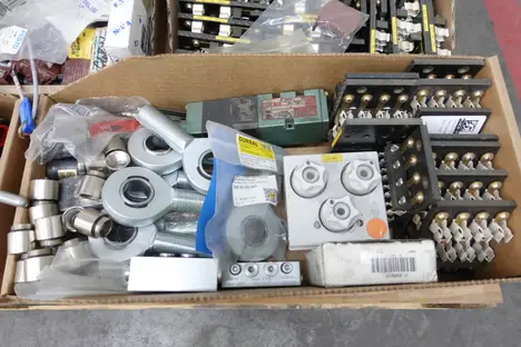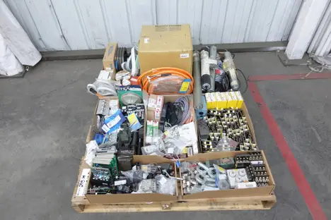 PALLET OF MIXED MRO, ASST. ELECTRICAL AND AUTOMATION, CONVEYOR PARTS, ROD END BEARINGS, VALVES AND VALVE PARTS; MARTIN, BUSSMAN, HUBBELL, NAT'L INSTRUMENTS, REXNORD, AB, FESTO, NUMATICS, OMRON