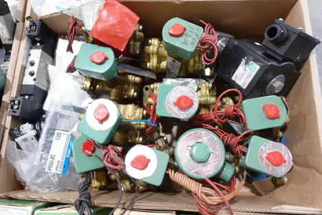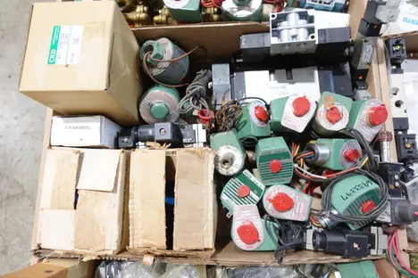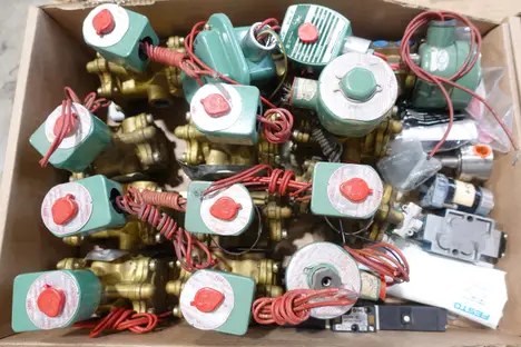 PALLET OF ASSORTED SOLENOID VALVES, ASCO, PARKER, FESTO, INGERSOLL-RAND, EMERSON, UNITED CONVEYOR, NORGREN