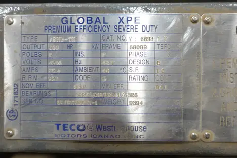 TECO WESTINGHOUSE V-6693-1-T PREMIUM EFFICIENCY SEVERE DUTY MOTOR, 600 HP, 3 PH, 927 RPM, 4000V, FR. 6808B, 6 POLE