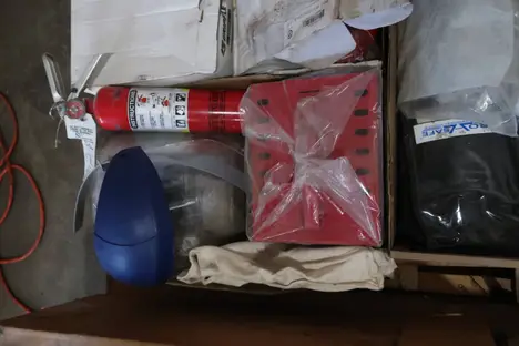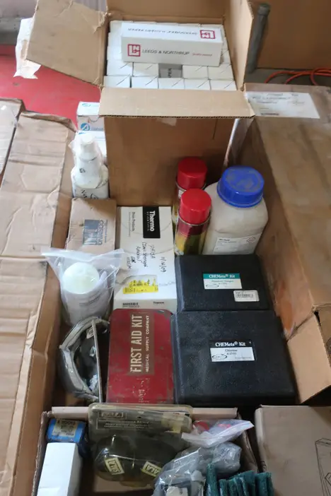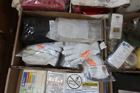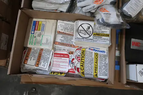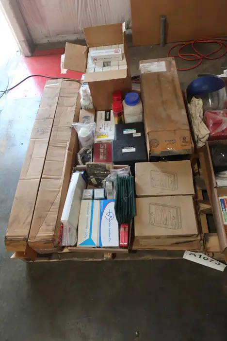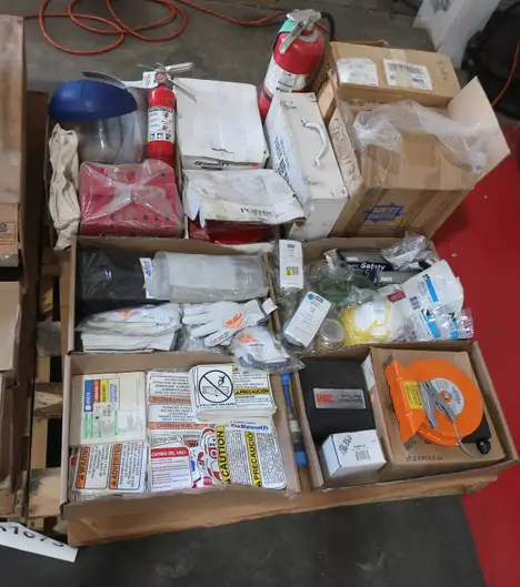 2 PALLETS OF ASSORTED PPE AND SAFETY, EXIT SIGNS, STICKERS, GLOVES, MASKS, SAFETY GLASSES, REEL FOR GROUNDING, BREATHER CAPS, HEAT TRACER, FIRE EXTINGUISHER, FIRE ALARM, LOCKOUTS, CHART GRAPH PAPER, THERMO, LEEDS AND NORTHRUP, ULINE, VAN LONDON COMPANY, GRIPPLE, WEST CHESTER, IDEAL, 3M