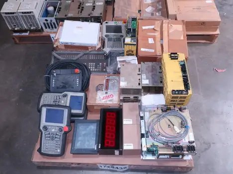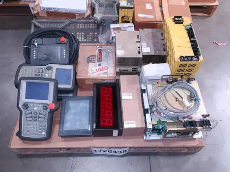 3 PALLETS OF ASSORTED AUTOMATION, INTERFACE PANELS, PCB CIRCUIT BOARDS, MODULES, PROGRAMMABLE CONTROLLERS, POWER SUPPLIES, CORDSET CABLES; AB, FUJI, MITSUBISHI, KANATA, FANUC, SIEMENS, HONEYWELL, GE