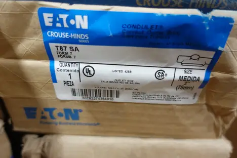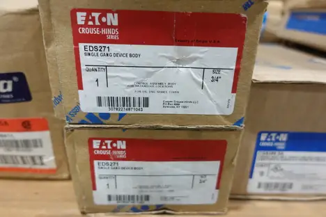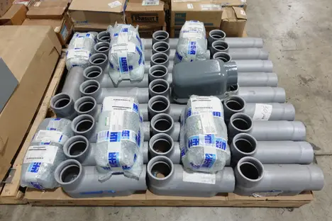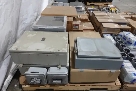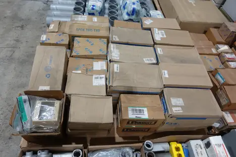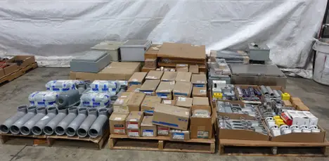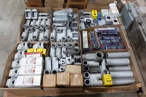 SKU 1737057 - 6 PALLETS OF ASSORTED ENCLOSURES, CONDUIT, PLUGS AND RECEPTACLES; EXM, RITTAL, HOFFMAN, CROUSE HINDS, PICOMA, APPLETON, OSRAM, PANDUIT, KILLARK, HUBBELL
