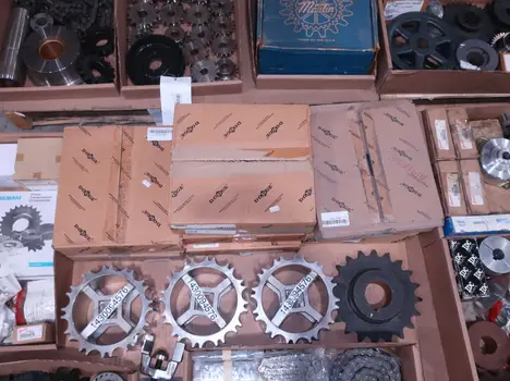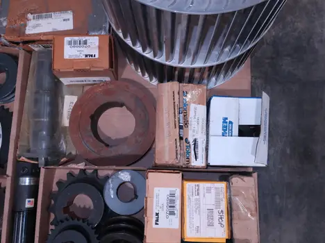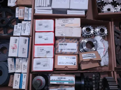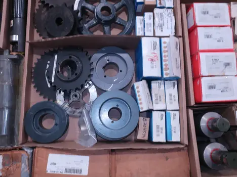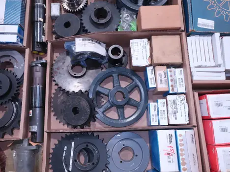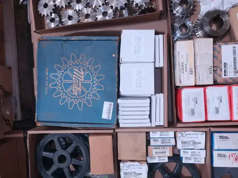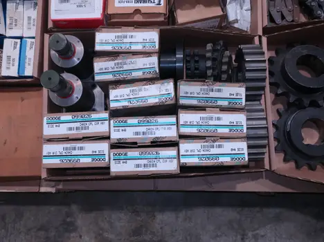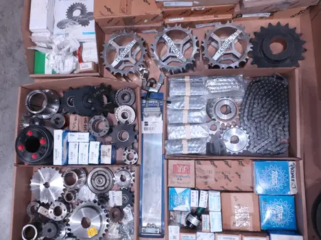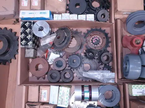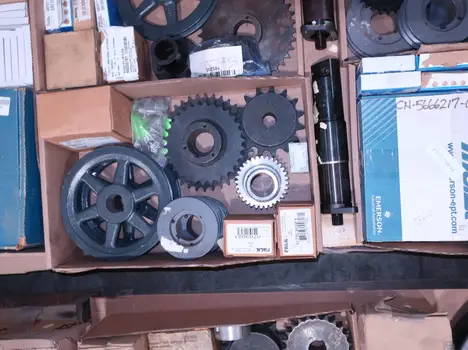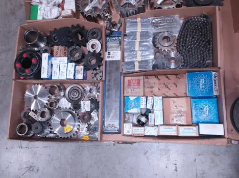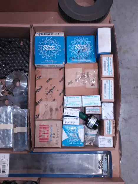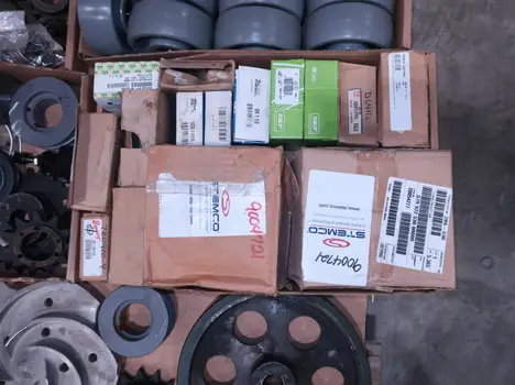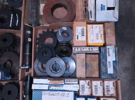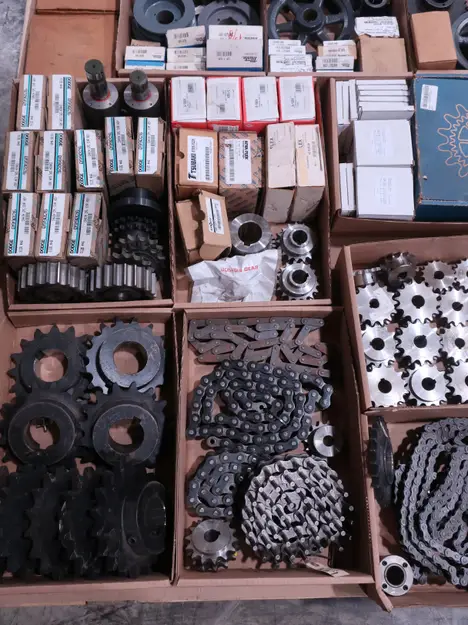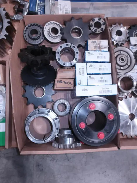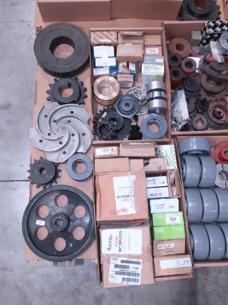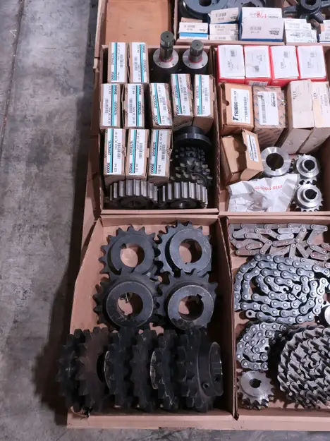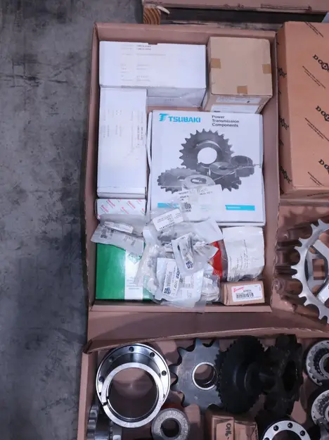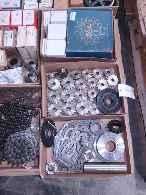 SKU 1738120 - 4 PALLETS OF ASSORTED POWER TRANS, SPROCKETS, GEARS, SEALS, BUSHINGS, COUPLINGS, PULLIES, ROLLER CHAIN, SABERTOOTH, GRID, COVER, GEARBOX, MARTIN, TB WOODS, BROWNING, LOVEJOY, DODGE, FALK, MORSE, REXNORD, PARKER, SKF, TSUBAKI
