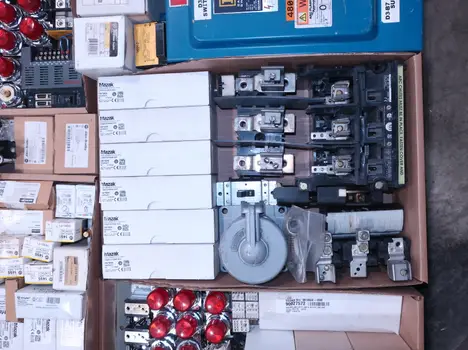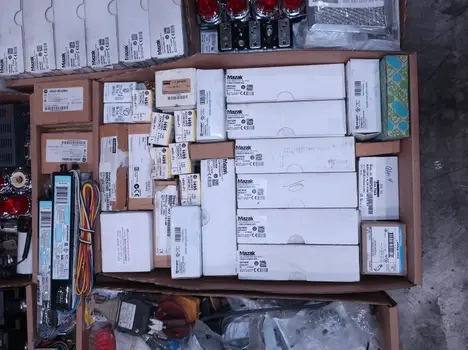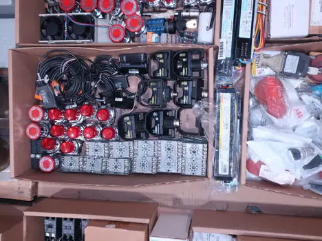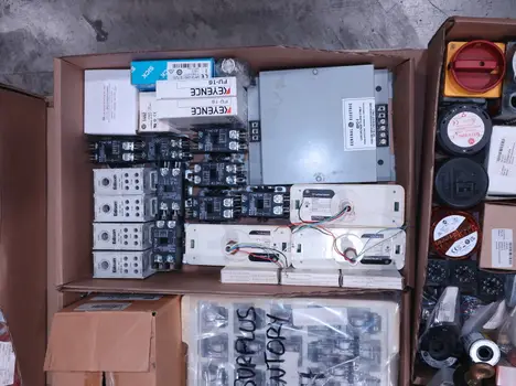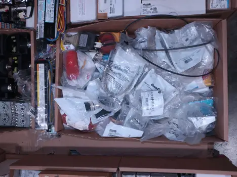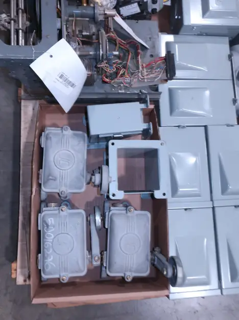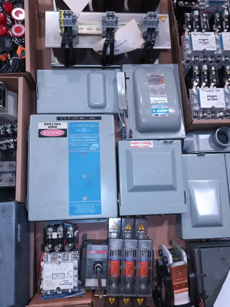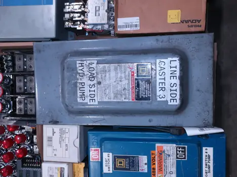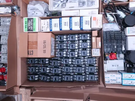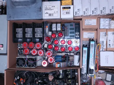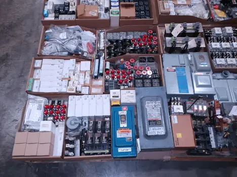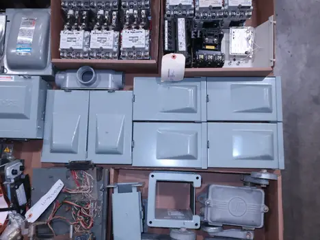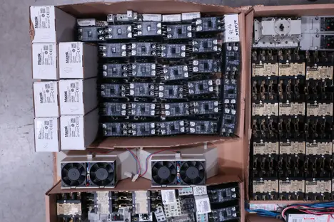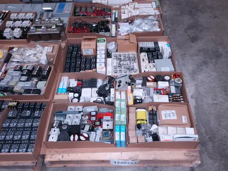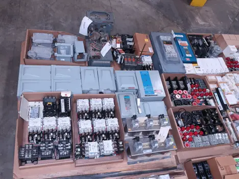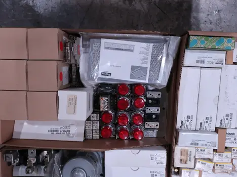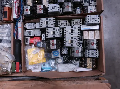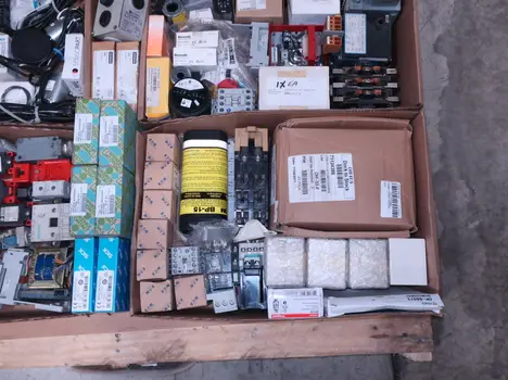 SKU 1738124 - 4 PALLETS OF ASSORTED ELECTRICAL COMPONENTS, LIGHTS, CONTACTORS, SWITCHES, CURRENT MONITORS, FANS, PUSH BUTTONS, RELAYS, TRANSFORMERS, SENSORS, PLUGS, CONDUIT, BALLASTS, ENCLOSURES, MOTOR CONTROLS, EATON, SQUARE D, PHOENIX CONTACT, AB, SIEMENS, FANUC, GE, HOFFMAN, GOULD, WESTINGHOUSE, OMRON, MAZAK, SICK, TELEMECANIQUE