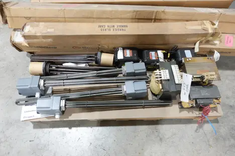 SKU 1753520 - 2 PALLETS OF ASSORTED HEATING AND COOLING REPLACEMENT PARTS, THERMOCOUPLES, BLOWER FANS, TRANSFORMERS, HEATING ELEMENTS, TEMPERATURE CONTROLLERS