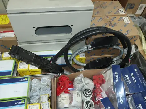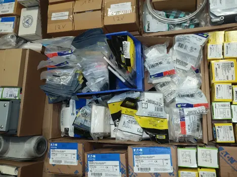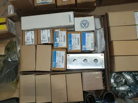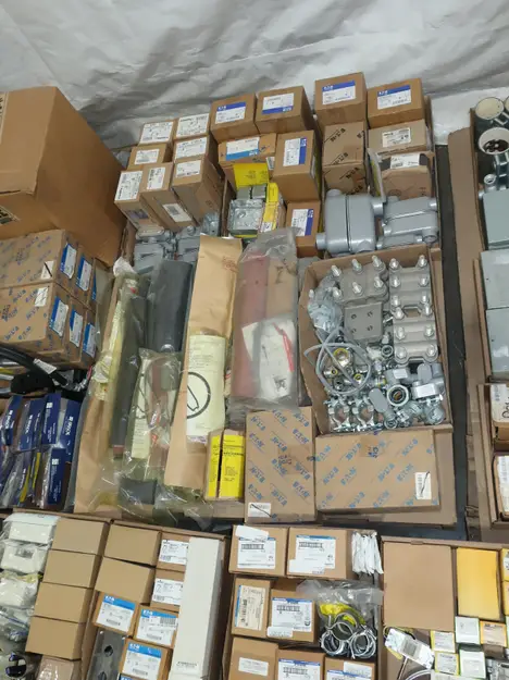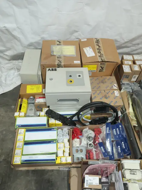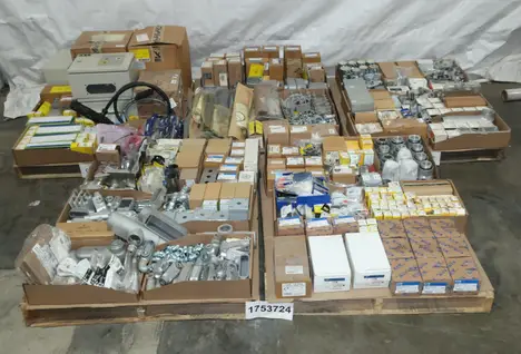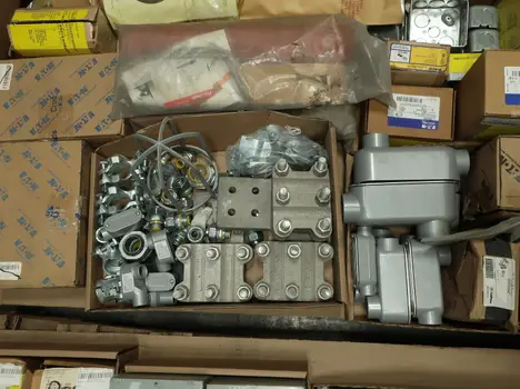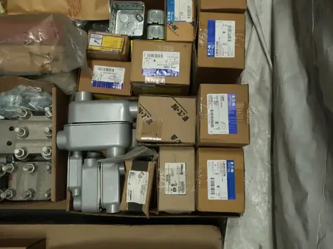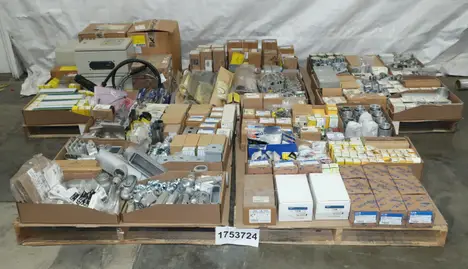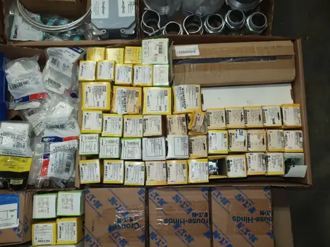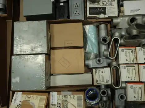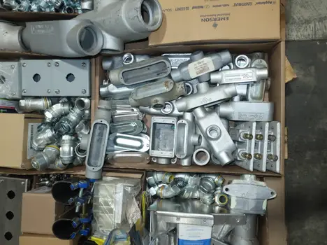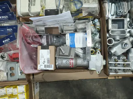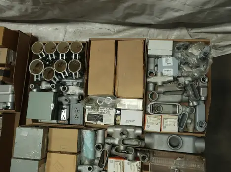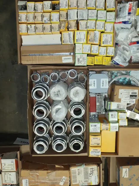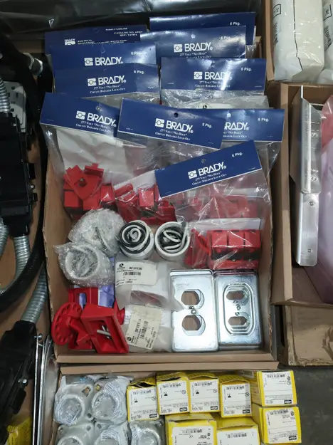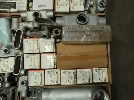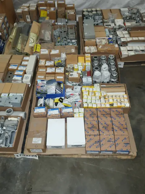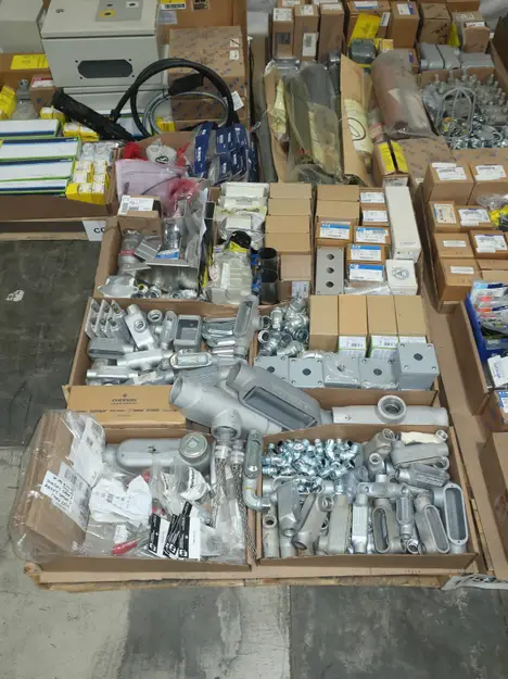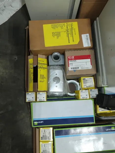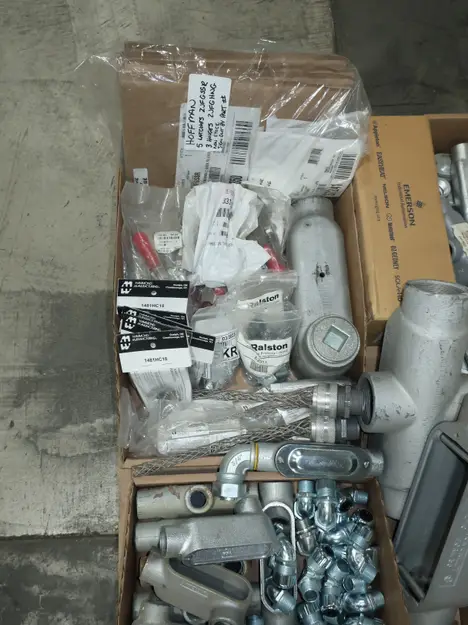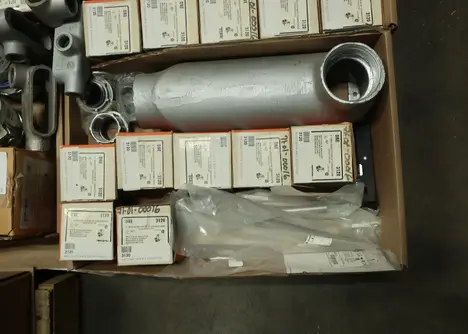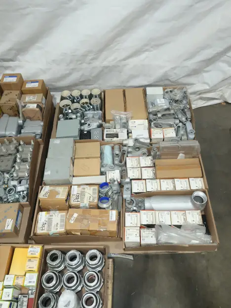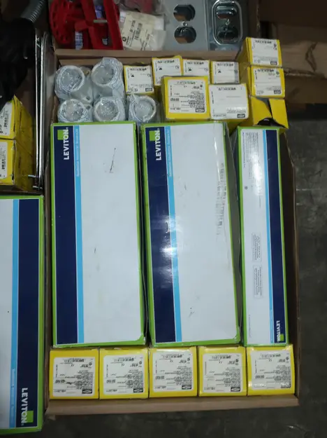 SKU 1753724- 5 PALLETS OF ELECTRICAL CONDUIT AND FITTINGS, PLUGS, BODIES, FITTINGS, CONNECTORS, RECEPTABLES, WALL PLATES, LOCK OUTS, ENCLOSURES, THERMOSTAT GUARDS, HOFFMAN, HAMMOND, EMERSON, EATON, LEVITON, APPLETON, PANDUIT, AB, HUBBELL, ABB, COOPER, CROUSE-HINDS, INTERMATIC, BRADY, RAYCHEM, DAYTON, THOMAS & BETTS