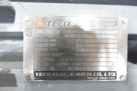 SKU 1761246 - TECO WESTINGHOUSE 150 HP INDUCTION MOTOR, 3 PH, 460V, 1775 RPM, FR. 445T