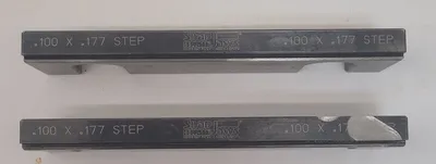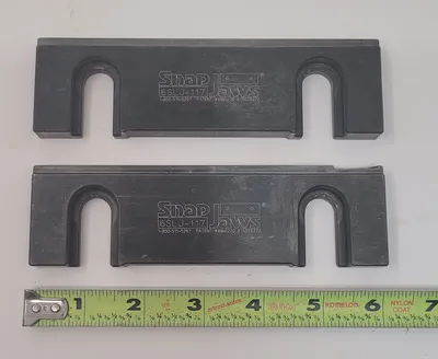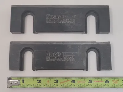 THE SNAP JAWS 6SLJ-117 QUICK CHANGE VISE JAWS ARE DESIGNED FOR PRECISION AND DURABILITY, SPECIFICALLY FOR USE WITH 6-INCH VISES. CONSTRUCTED FROM HARDENED STEEL, THESE FIXED JAWS ARE ENGINEERED TO WITHSTAND RIGOROUS TOOLING APPLICATIONS. THE SET INCLUDES TWO STEP-SHAPED JAWS, EACH WITH A WIDTH OF 6.0000 INCHES, A HEIGHT OF 1.7500 INCHES, AND A THICKNESS OF 0.5000 INCHES. THE JAWS FEATURE A LOW PROFILE AND A THIN LEDGE, ENHANCING THEIR VERSATILITY FOR VARIOUS MACHINING TASKS. THE STEP HEIGHT IS 0.1770 INCHES, AND THE STEP WIDTH IS 3/8 INCHES, ALLOWING FOR PRECISE POSITIONING AND SECURE CLAMPING. THESE JAWS ARE PRECISION GROUND TO ENSURE A RELIABLE AND ACCURATE FIT, MAKING THEM AN ESSENTIAL COMPONENT FOR ANY COMPATIBLE 6-INCH VISE SETUP.