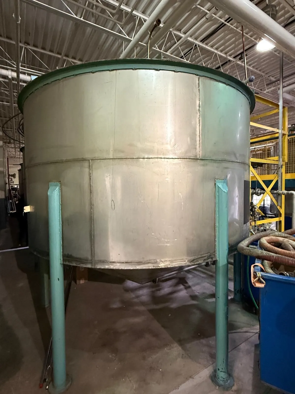 THIS SPARLING BOTTLING AND PROCESS STORAGE TANK FEATURES A STAINLESS STEEL CONSTRUCTION WITH A CAPACITY OF 13,800 LITERS (3,600 US GALLONS). THE UNIT IS DESIGNED AS A VERTICAL CYLINDRICAL VESSEL EQUIPPED WITH A CONE-BOTTOM FOR EFFICIENT DRAINAGE. FOR INSTALLATION, THE TANK IS MOUNTED ON ELEVATED STRUCTURAL STEEL LEGS. TECHNICAL SPECIFICATIONS INCLUDE OVERALL DIMENSIONS OF 120 X 120 X 67 INCHES AND A TOTAL WEIGHT OF 6,000 LBS.