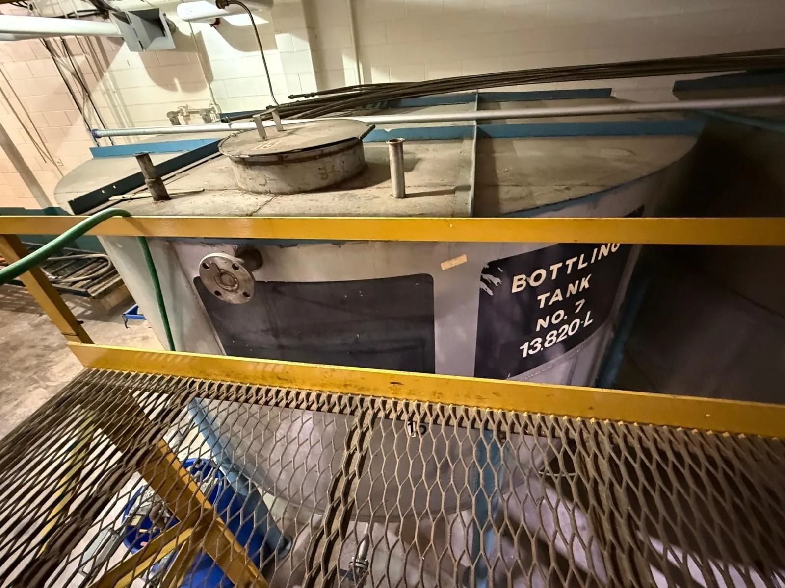 THIS SPARLING BOTTLING AND PROCESS STORAGE TANK FEATURES A STAINLESS STEEL CONSTRUCTION WITH A CAPACITY OF 13,800 LITERS (3,600 US GALLONS). THE UNIT IS DESIGNED AS A VERTICAL CYLINDRICAL VESSEL EQUIPPED WITH A CONE-BOTTOM FOR EFFICIENT DRAINAGE. FOR INSTALLATION, THE TANK IS MOUNTED ON ELEVATED STRUCTURAL STEEL LEGS. TECHNICAL SPECIFICATIONS INCLUDE OVERALL DIMENSIONS OF 120 X 120 X 67 INCHES AND A TOTAL WEIGHT OF 6,000 LBS.