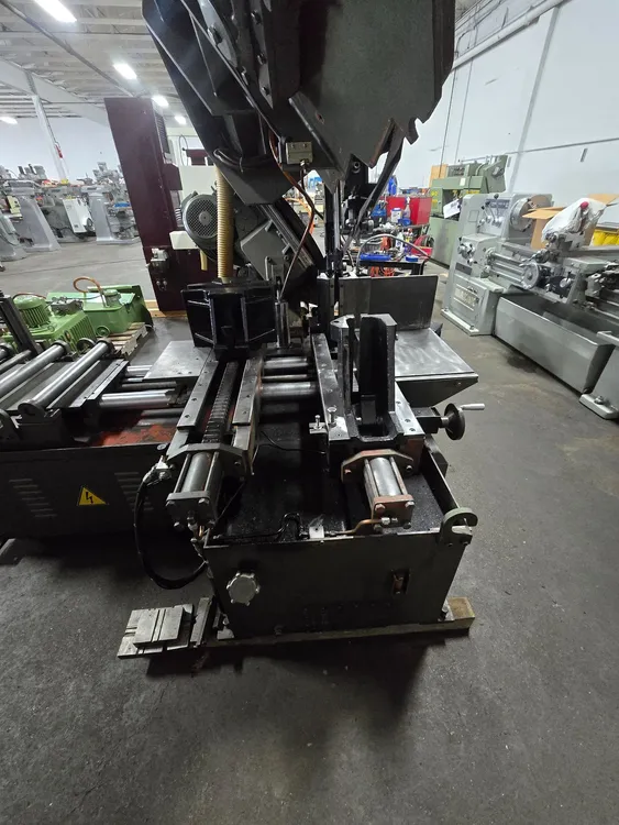 THE SPARTAN MODEL PA18 IS AN AUTOMATIC HORIZONTAL BANDSAW WITH A CUTTING CAPACITY OF 18 INCHES HIGH BY 18 INCHES WIDE, OR AN 18-INCH ROUND DIAMETER. IT UTILIZES A BLADE MEASURING 1.5 INCHES WIDE BY 0.050 INCHES THICK AND 15 FEET 4 INCHES (184 INCHES) IN LENGTH. BLADE SPEEDS ARE INFINITELY VARIABLE, RANGING FROM 60 TO 330 FEET PER MINUTE (FPM). POWER IS SUPPLIED BY A 7-1/2 HP MAIN DRIVE MOTOR, A 2 HP HYDRAULIC MOTOR, AND A 1/4 HP COOLANT MOTOR, WIRED FOR 3 PHASE, 60 CYCLE, 230 VOLTS OPERATION. THE MACHINE INCLUDES AN AUTOMATIC SHUTTLE VISE WITH A 20-INCH MAXIMUM STROKE, A CONTROL CONSOLE WITH DIGITAL BLADE SPEED READ-OUT AND A DIGITAL PIECE COUNTER, A MULTIPLE VISE INDEX PUSH BUTTON, ADJUSTABLE HYDRAULIC VISE PRESSURE, AND A COOLANT PUMP. THE WORK LOAD CAPACITY IS 7,250 POUNDS, AND THE WORK SURFACE IS 27 INCHES FROM THE FLOOR. OVERALL SIZE IS 100 INCHES LONG BY 84 INCHES WIDE BY 71 INCHES HIGH, WITH A WEIGHT OF 5,500 POUNDS.