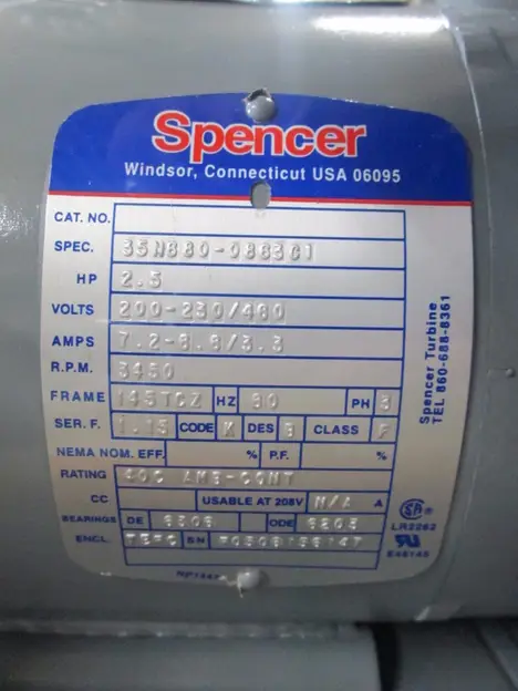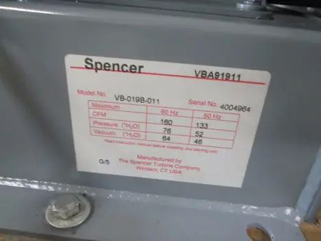 Spencer VB-019B-011 160 Max CFM 200-230/460V 3Ph Vortex Regenerative Blower Make: Spencer Model: VB-019B-011 Serial: 4004964 Max CFM: 160 Max Pressure: 76 Max Vacuum: 64 3450 Motor Rpm 2.5 Hp 200-230/460 Volt 3Ph 60 Hz Asset In Great Overall Condition Tes