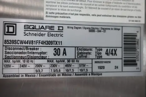 SQUARE D 8539SCW44V81FF4H309TX11 10HP SIZE 1 COMBINATION STARTER