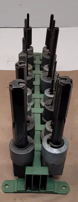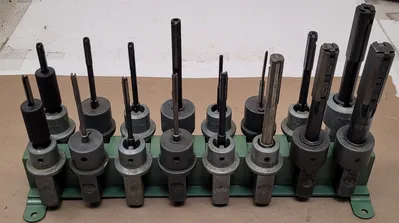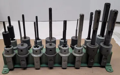 THE SUNNEN HONING MANDREL SET IS A COMPREHENSIVE COLLECTION OF 16 HONING MANDRELS, DESIGNED FOR PRECISION MACHINING TASKS. THIS SET INCLUDES A VARIETY OF MANDREL SIZES, PROVIDING VERSATILITY FOR DIFFERENT APPLICATIONS. THE SET FEATURES THE FOLLOWING MANDRELS: K8 ADAPTER WITH AN UNIDENTIFIABLE MANDREL, K8-265AH WITH S-245 SLEEVE, K10-339AH WITH S-354 SLEEVE, K5-175CH, K10-347AH, AK20-744UA, K4-135CS, K8-265AS, K10-339AH, AK20-838UB, K16-588AS, K8-280AH, K16-495AH, AK20-994UC, AND K10-331AH. EACH MANDREL IS CRAFTED TO MEET HIGH STANDARDS OF PRECISION AND DURABILITY, MAKING THEM SUITABLE FOR A RANGE OF HONING APPLICATIONS. THE SET IS ACCOMPANIED BY A RACK FOR ORGANIZED STORAGE AND EASY ACCESS, ENSURING THAT THE MANDRELS ARE KEPT IN OPTIMAL CONDITION AND READILY AVAILABLE FOR USE. THIS SUNNEN HONING MANDREL SET IS AN ESSENTIAL ADDITION TO ANY TOOLING COLLECTION, OFFERING RELIABLE PERFORMANCE AND ADAPTABILITY FOR VARIOUS MACHINING NEEDS.