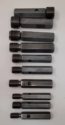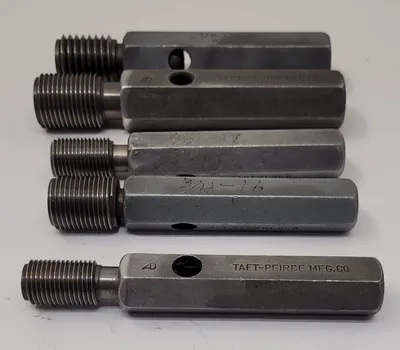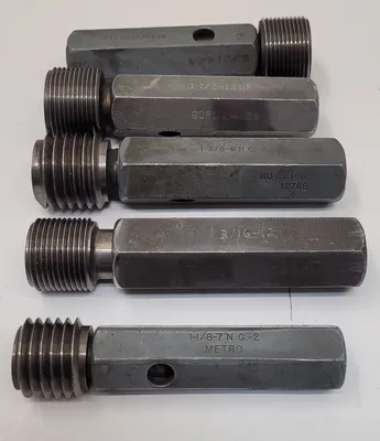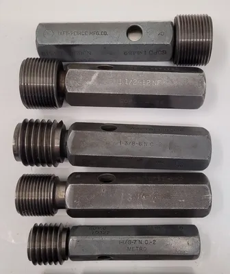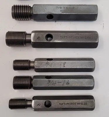 THE TAFT-PEIRCE GO/NO GO PLUG GAUGE SET COMPRISES 10 PRECISION-ENGINEERED GAUGES DESIGNED FOR ACCURATE MEASUREMENT VERIFICATION IN TOOLING OPERATIONS. THIS SET INCLUDES A VARIETY OF SIZES TO ACCOMMODATE DIFFERENT THREADING STANDARDS, ENSURING VERSATILITY IN APPLICATION. THE SIZES INCLUDED ARE TWO GAUGES FOR 1-1/2-12 NF, ONE GAUGE FOR 1-3/16-12 NS, ONE FOR 1-3/8-6 NC2, ONE FOR 7/8-9 NC2, ONE FOR 1-1/8-7 NC2, ONE FOR 7/8-14 N, ONE FOR 9/16-18 NF, ONE FOR 3/4-16 NF, AND ONE FOR 5/8-18 NF. EACH GAUGE IS CRAFTED TO MEET STRINGENT QUALITY STANDARDS, PROVIDING RELIABLE GO/NO GO TESTING FOR THREADED COMPONENTS. THE SET IS IDEAL FOR ENSURING COMPLIANCE WITH SPECIFIED TOLERANCES, ENHANCING THE PRECISION AND EFFICIENCY OF MANUFACTURING PROCESSES.