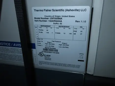 THERMO SCIENTIFIC, REVCO, UPRIGHT ULTRA LOW TEMPERATURE FREEZER, VOLTS-115, AMPS-16, HZ-60, PHASE 1