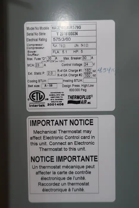 THERMOPLUS VERTICAL WATER-COOLED AIR CONDITIONER - MODEL KACE180V85RT-79G, 5HP, 575V-AC