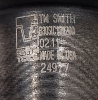 THE TM SMITH B30SIC16M200 IS A PRECISION TOOL HOLDER DESIGNED FOR USE WITH BT30 SPINDLES. IT FEATURES AN M16 THREAD AND OFFERS A PROJECTION OF 1.92 INCHES. THE OVERALL LENGTH OF THE TOOL HOLDER, EXCLUDING THE BUTTON, IS 3.90 INCHES. THE BODY DIAMETER MEASURES 1.80 INCHES, WHILE THE BORE INSIDE DIAMETER IS .68 INCHES. THIS TOOL HOLDER IS ENGINEERED TO MEET HIGH PRECISION REQUIREMENTS IN MACHINING APPLICATIONS.