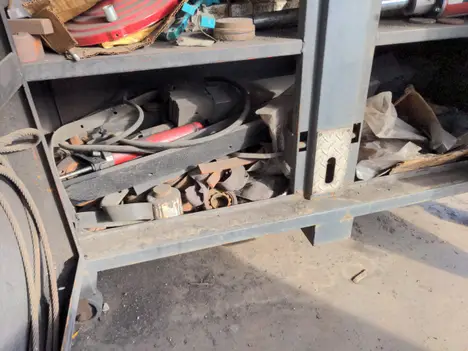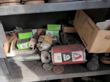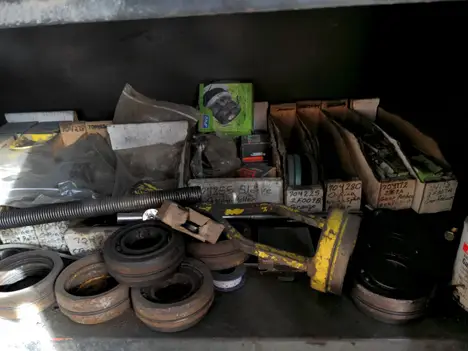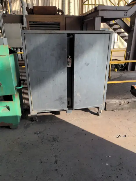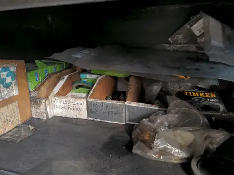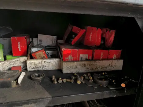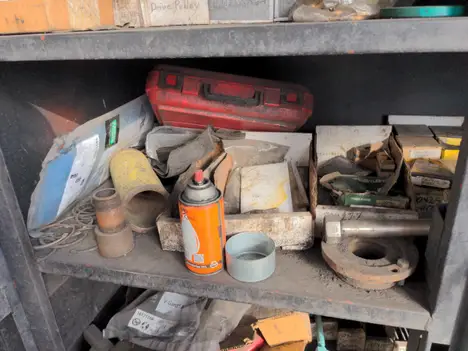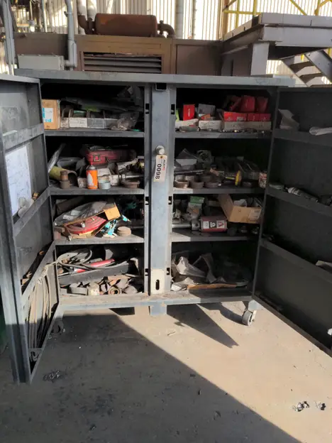 Tool box on casters with nuts and bolts and contents