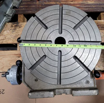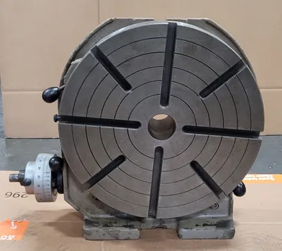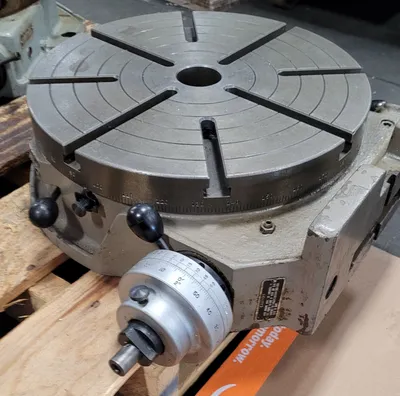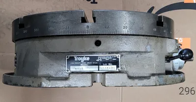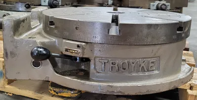 THE TROYKE U-15 ROTARY TABLE IS DESIGNED FOR PRECISION IN BOTH HORIZONTAL AND VERTICAL MANUAL OPERATIONS. IT FEATURES A 15-INCH OVERALL DIAMETER, PROVIDING AMPLE SURFACE AREA FOR VARIOUS MACHINING TASKS. THE TABLE IS EQUIPPED WITH A 2-INCH BORE CENTER HOLE, ALLOWING FOR SECURE MOUNTING AND ALIGNMENT OF WORKPIECES. THE T-SLOTTED SURFACE ENHANCES VERSATILITY, ENABLING THE ATTACHMENT OF FIXTURES AND CLAMPS FOR STABLE OPERATION. THIS ROTARY TABLE IS SUITABLE FOR APPLICATIONS REQUIRING PRECISE ROTATIONAL MOVEMENT AND POSITIONING.